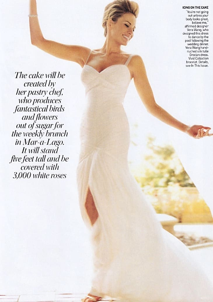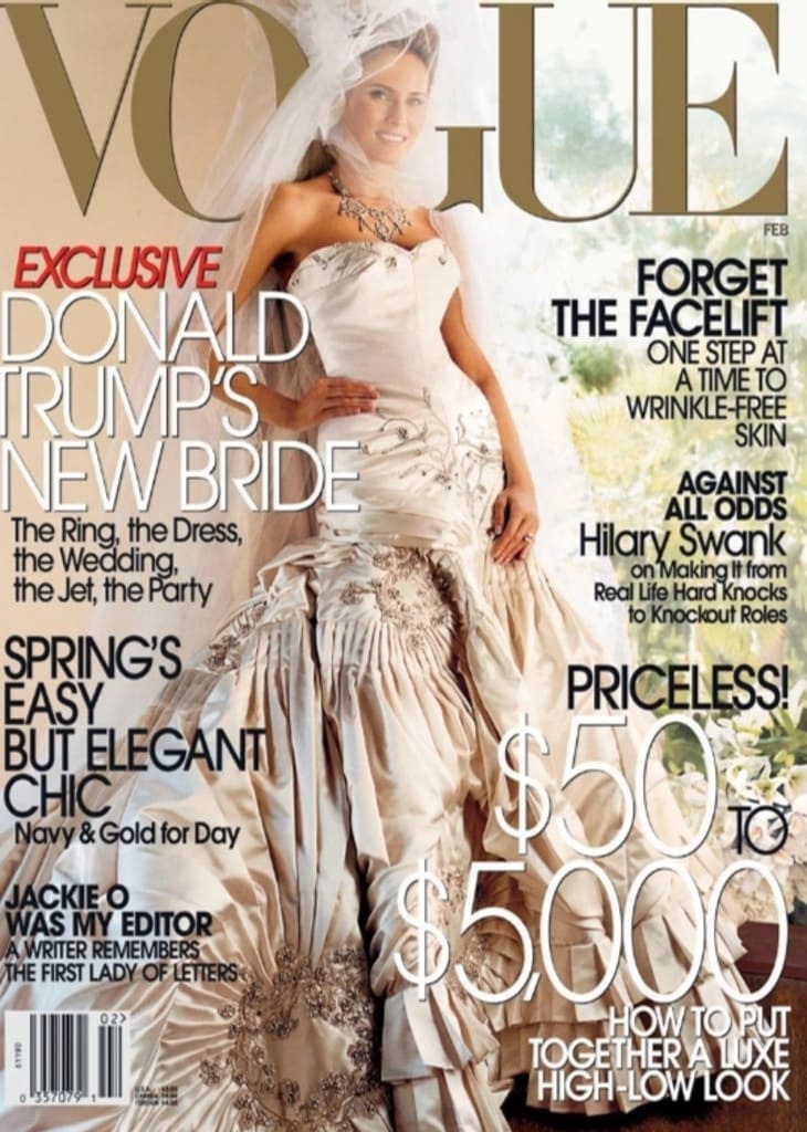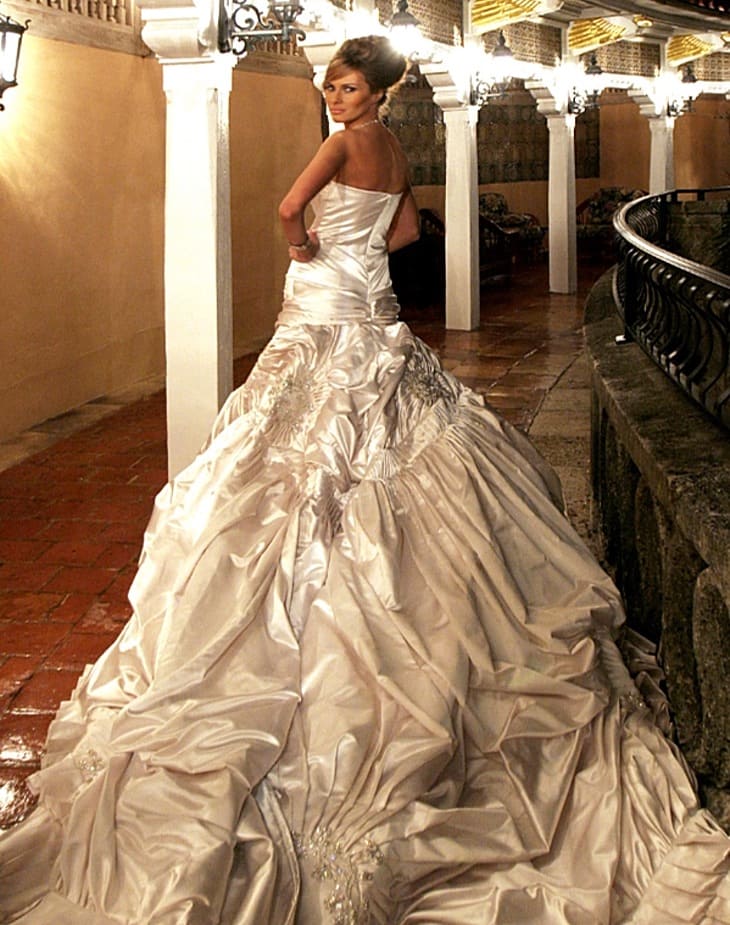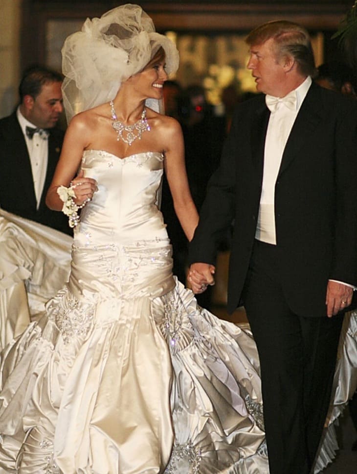 Melania está casada com Trump há mais de 20 anos. Depois que ele se tornou presidente, os jornalistas começaram a procurar fotos antigas da família e encontraram fotos do casamento. Olhando para elas, percebe-se que, mesmo naquela época, Melania já sabia escolher looks elegantes. O primeiro vestido é simplesmente deslumbrante. Segundo fontes confiáveis, ele foi costurado com 90 metros de tecido e pesava cerca de 30 kg. O vestido foi decorado com pérolas e pedras preciosas.