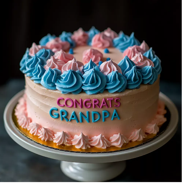 Ela riu, os seus olhos brilhando com a mesma energia nervosa que durante o jantar. Só que agora tudo fazia sentido. «Sim! Eu queria fazer uma surpresa para ti», disse ela, dando um passo à frente e levantando o bolo como se fosse um troféu. Era branco com cobertura azul e rosa, e na parte superior estava escrito em letras grandes: «Parabéns, avô!»