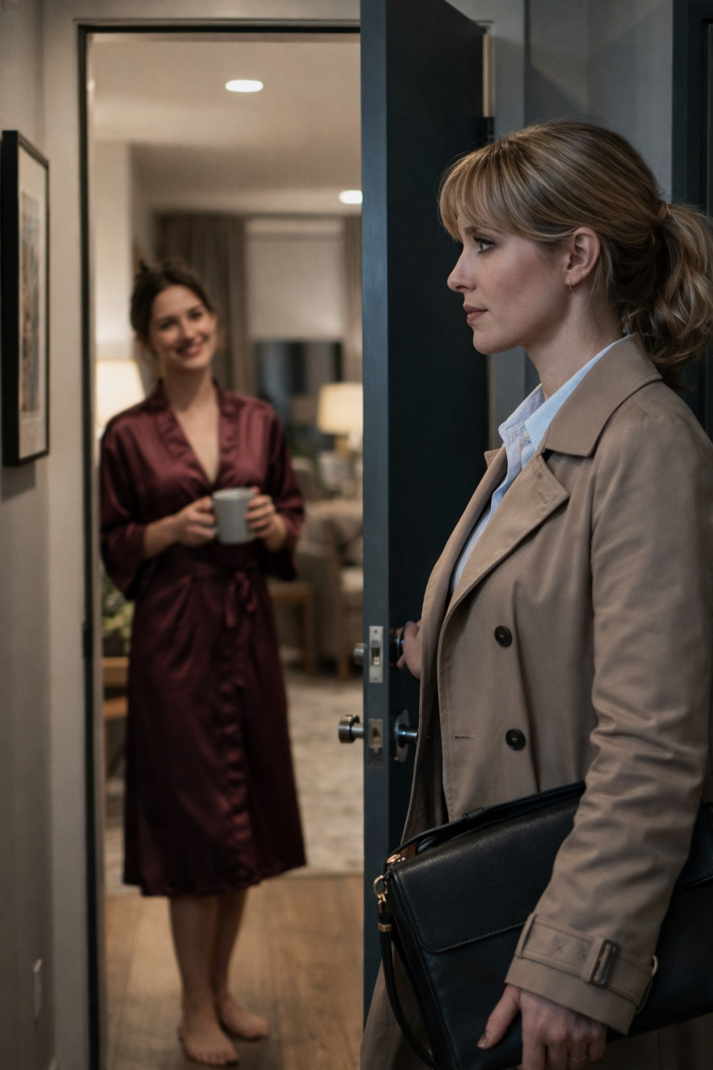 Ela vestiu um robe, saiu do quarto em silêncio e caminhou descalça, encostando-se à parede. A porta do escritório estava quase fechada. Então, outra voz surgiu lá de dentro: