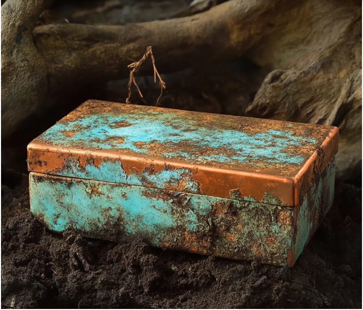 Lá, na terra escura, como uma estrela enterrada, estava uma pequena caixa de cobre, cuja superfície havia ficado turquesa com o tempo.