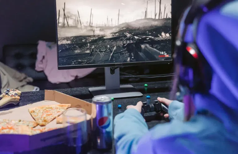 Aproximei-me e ouvi sons abafados. Abri a porta silenciosamente, sem acender a luz, para ver o que estava a acontecer. Soltei um grito quando vi o Mark na penumbra, com auscultadores, um comando nas mãos, rodeado de latas vazias de bebidas energéticas e embalagens de snacks. Mas isso não era o mais estranho.