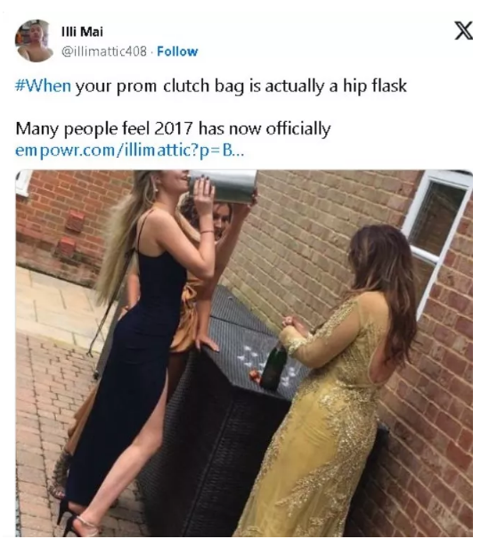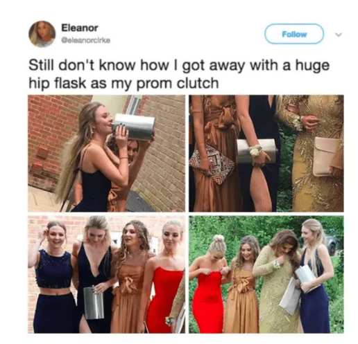Agora olhe para a aluna do último ano do ensino secundário, que esconde habilmente o frasco debaixo do seu vestido. Ela modernizou a bolsa de mão de tal forma que ninguém percebeu que não era realmente uma bolsa. Naturalmente, os professores não perceberam a fraude, por isso não tiveram nenhuma reclamação contra a elegante formanda. Mas se você já sabe a verdade, vai perceber imediatamente que se trata de um frasco, não é mesmo?