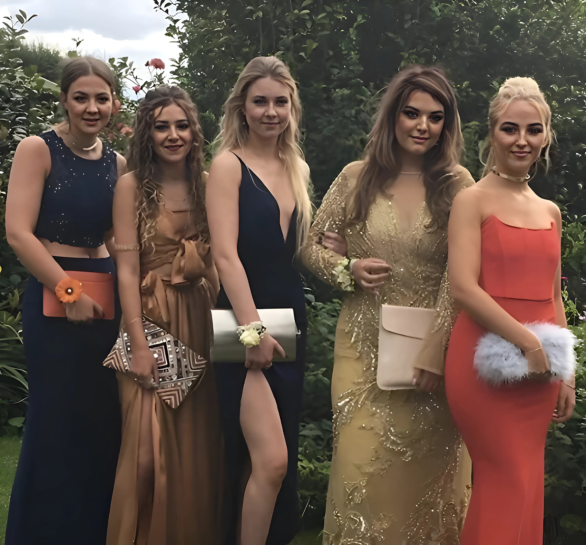 As meninas provavelmente se prepararam para a noite de formatura. Todas estão bonitas e bem vestidas.