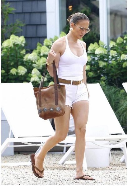 Lopez não tem vergonha de andar pela cidade de calções, embora a sua silhueta já não seja absolutamente perfeita; os anos fazem-se sentir.