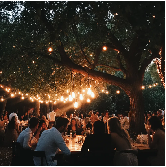 Um murmúrio baixo de risos e conversas enchia o ar na nossa festa de casamento, misturando-se com o tilintar dos talheres.
