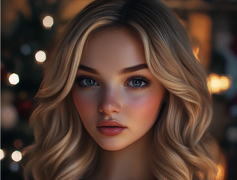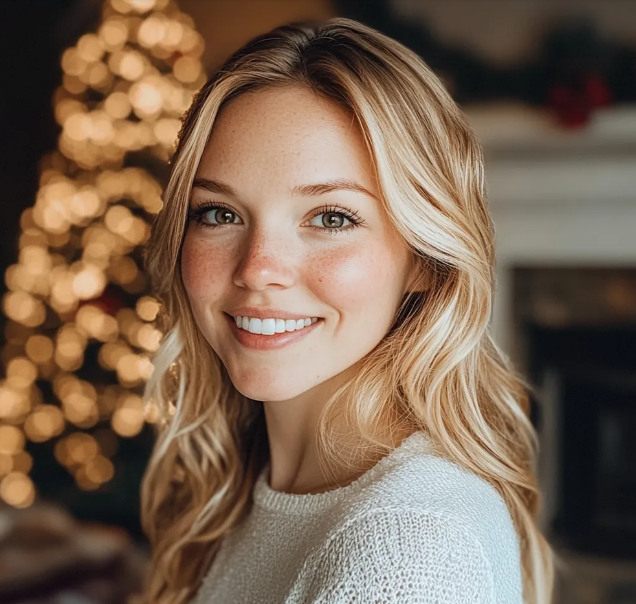 A sala de estar atrás dela parecia uma imagem dourada da perfeição natalícia.