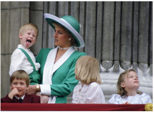 Numa das fotos favoritas, o príncipe Harry mostra a língua para a multidão em frente ao Palácio de Buckingham, com Diana ao seu lado. A sua reação divertida tornou-se instantaneamente icónica, demonstrando a cordialidade e o humor que a tornaram tão querida.