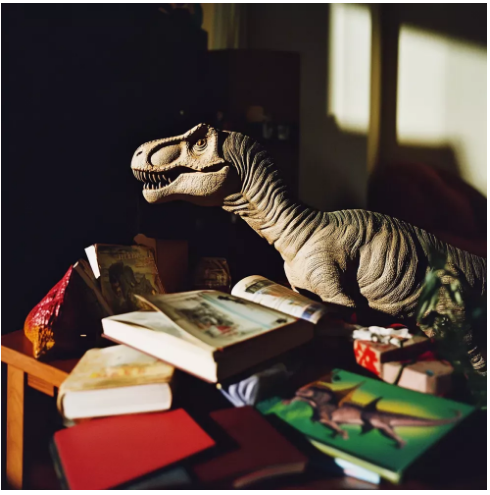 Ele olhou para mim, depois para o dinossauro.