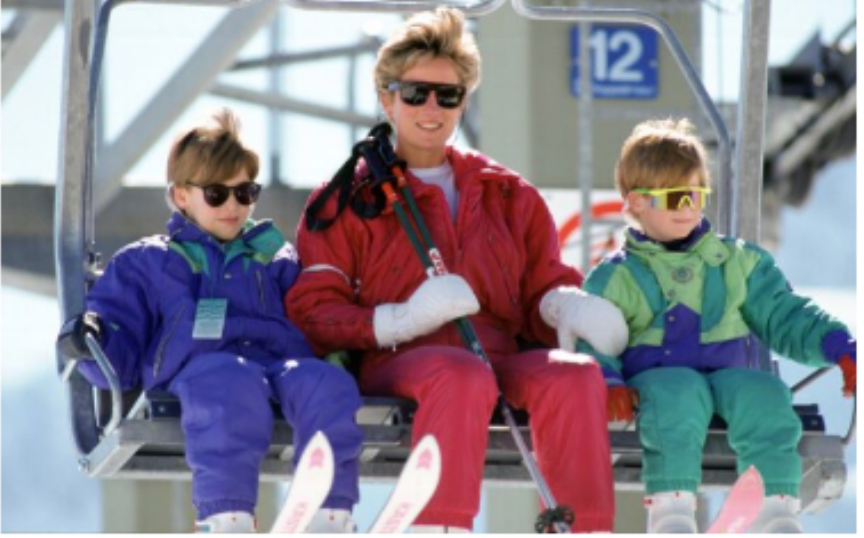 Numa dessas fotos, tirada em 1994, Diana aparece a esquiar na Áustria com os seus filhos, o príncipe William e o príncipe Harry, que na época tinham apenas 9 anos.