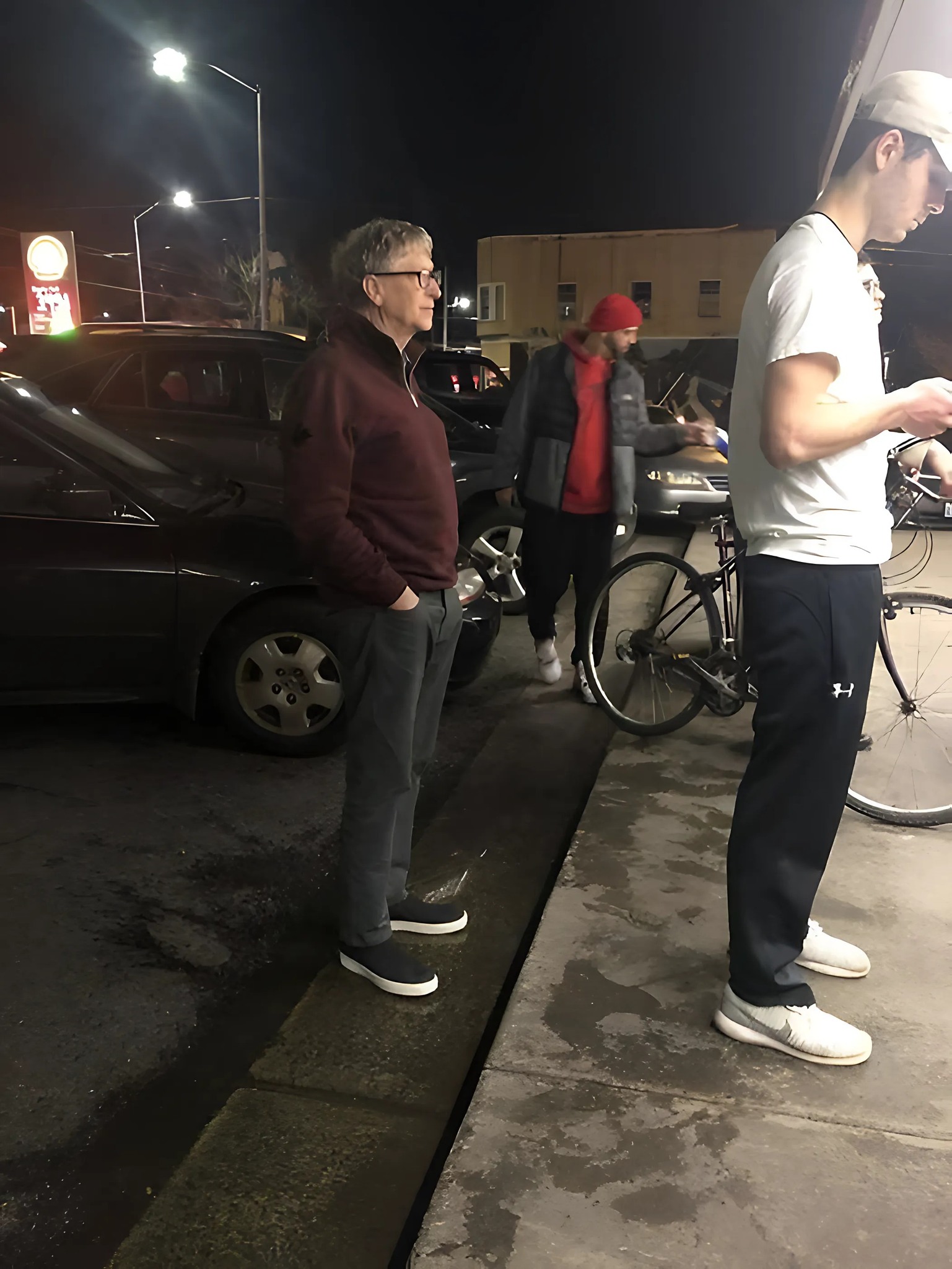 Bill Gates esqueceu que tem US$ 100 bilhões e espera na fila pelo seu hambúrguer.Uma foto do bilionário