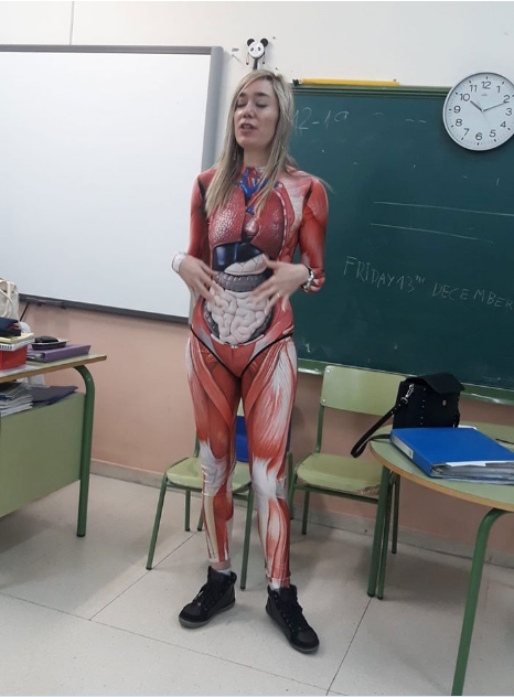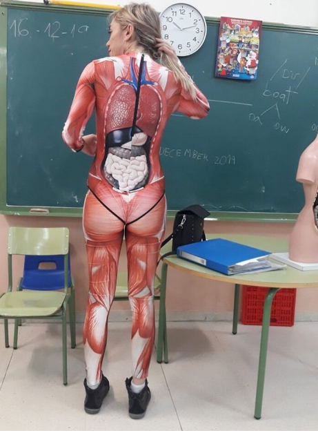 Veronica Duque abordou de forma muito criativa a organização da aula de anatomia. Ela vestiu um fato especial justo, no qual todos os órgãos estavam desenhados. A professora observa que trabalha na escola há mais de 15 anos e, durante esse tempo, aprendeu a não ensinar ciência de forma árida, mas a misturá-la com arte e outras áreas.